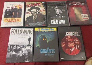 Pack de ocho películas en formato DVD, ideal para coleccionistas y amantes del cine. 3€ cada uno: - Tombstone - Ciudadano Kane - Cold War - El Resplandor - Following - El Gigante de Hierro - Chacal - Seven 6€