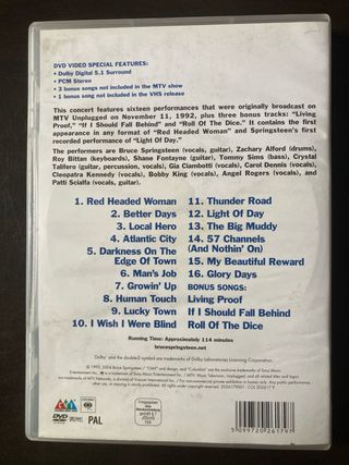 DVD de Bruce Springsteen MTV Unplugged en perfecto estado. Incluye 16 actuaciones del programa MTV, más 3 temas extra. - Contiene el primer vídeo de Springsteen interpretando "Red Headed Woman". - Se incluyen actuaciones de Roy Bittan, Shane Fontayne, etc. - Duración aproximada: 114 minutos.