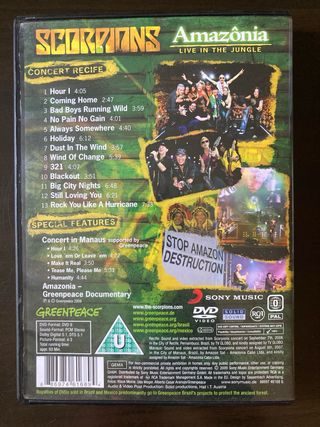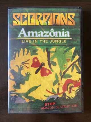 DVD de Scorpions Amazônia: Concierto en vivo desde la jungla. El DVD está en buenas condiciones. - Incluye el concierto completo de Scorpions en la Amazonía. - Contiene un documental de Greenpeace. - Presenta actuaciones especiales de Manau.