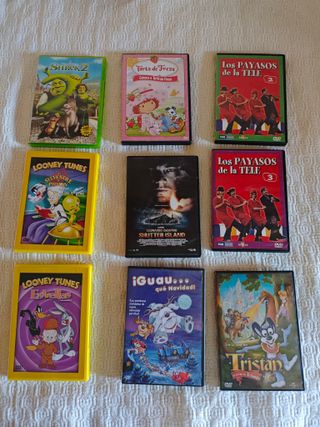 Vendo diferentes películas DVD de dibujos animados en perfecto estado, los títulos son: - los payasos de la tele 2 - los payasos de la tele 3 - Shrek 2 - Tristán en el reino de irelandis - conoce a tarta de fresa - Guau que navidad, las aventuras navideñas de 9 perritos adorables - Looney Tunes Estrellas Looney Tunes (Silvestre y Piolín) - DVD disco Shutter Island Leonardo DiCaprio vértice Cada una son 3,5€
