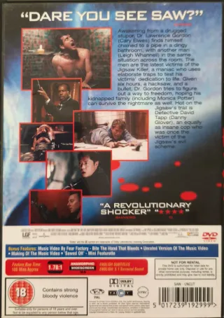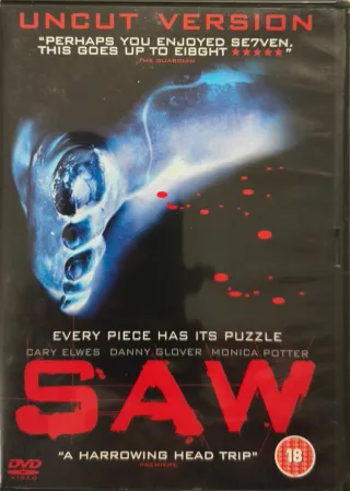Película de terror Saw en su versión sin cortar. Disfruta de esta intensa experiencia. - Incluye Uncut Version. - Calificación para mayores de 18 años.
