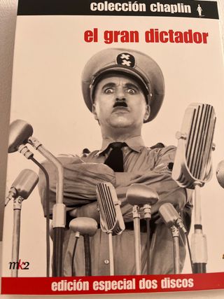 DVD “El gran dictador” (Edición especial dos discos), escrita, dirigida y protagonizada por Charles Chaplin. Una obra maestra del cine universal y una de las sátiras políticas más célebres de la historia, donde Chaplin interpreta a un barbero judío confundido con un dictador megalómano. Edición especial de la Colección Chaplin (MK2 / Warner), con dos discos que incluyen la película restaurada y valiosos contenidos extra. En muy buen estado, con su estuche original desplegable. Solo tiene una pequeña arruga en la parte inferior izquierda de la caja (ver foto). Otros DVDs de mi colección en mi perfil.