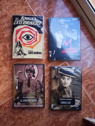 Conjunto de cuatro DVDs de películas clásicas. - El Ángel Exterminador (Luis Buñuel) - M, El Vampiro de Düsseldorf (Fritz Lang) - El Gran Dictador (Charles Chaplin) - Candilejas (Charles Chaplin) Todas precintadas.