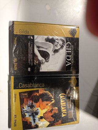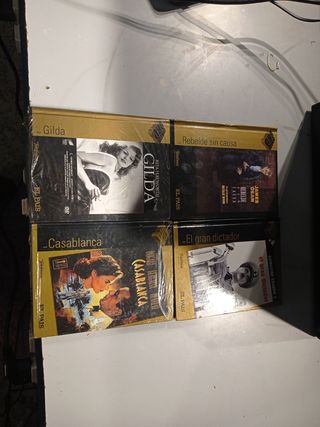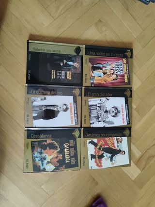 34 discos de cine clásico en dvd. Cine de oro El País. Tienen un libreto estupendo con muchas páginas. Casablanca Doctor Zhivago Con la muerte en los talones Mogambo Tener o no tener El gran dictador Una noche en la opera Lo que el viento se llevó Cayo Largo Bonnie y Clyde Arsénico por compasión Esplendor en la hierba Extraños en un tren Un Americano en París El halcón Maltés La gata sobre el tejado de Zinc La quimera de oro My Fair Lady El sueño eterno Centauros del desierto Ben-Hur Cantando bajo la lluvia Un día en las carreras Doce del patíbulo La costilla de Adán Días de vino y rosas Gigi Tiempos modernos Robin de los bosques Lu