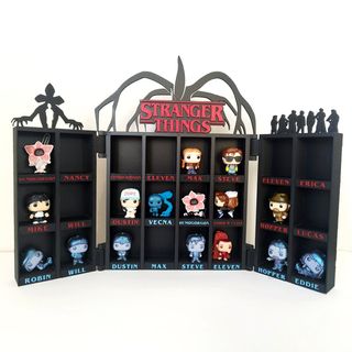 Expositor de funkos joy de la colección Stranger Things. Ideal para coleccionistas. Personalizable con tu nombre. Preparamos cualquier diseño que desees. Servicio de impresión 3D, @3creatorD. #strangerthings #demogorgon #mundoalreves #cosasextrañas #azotamentes #eleven #steve #11 #will #mike #netflix #series #kinderjoy #upside - Diseño inspirado en la serie. - Estructura negra con compartimentos.