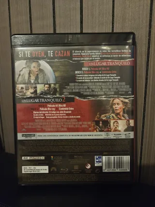 Colección de 2 películas en formato Blu-ray 4K UHD. - 4 discos. - Incluye Un Lugar Tranquilo y su secuela. - Audio en inglés y español. - Formato de alta definición 4K UHD.