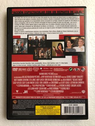Película Ocean's Twelve en formato DVD. - Reparto: George Clooney, Brad Pitt, Matt Damon, Catherine Zeta-Jones, Andy Garcia, Don Cheadle, Bernie Mac y Julia Roberts. - Idiomas: Inglés y Español. - Género: Acción, Aventura, Crimen, Thriller.