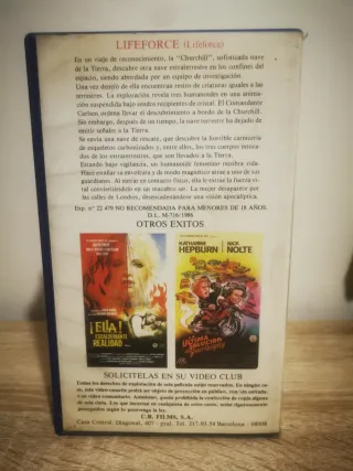 Película en formato VHS de Lifeforce (Fuerza Vital). - Con el Cometa Halley, llega el terror!! - Los creadores de Alien, La Guerra de las Galaxias y Poltergeist, ahora juntos en... - Incluye audio en inglés y español.