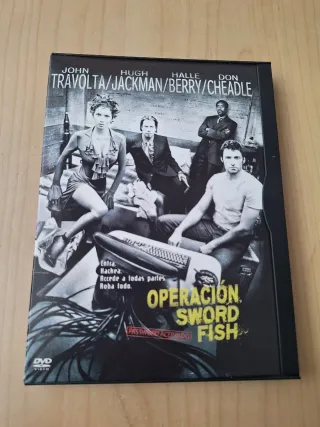 D.REF.0061 Película de acción Operación Swordfish en formato DVD. - Protagonizada por John Travolta, Hugh Jackman, Halle Berry y Don Cheadle. - Incluye audio en inglés y español. - Género: Acción, Crimen, Thriller.