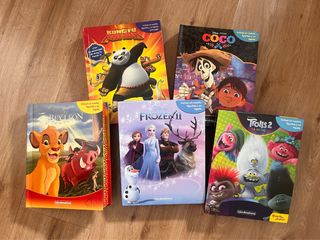 Libros de películas de dibujos que contienen figuras. Las figuras tienen entre 3/5 cm. Algunas están más usadas que otras. Frozen, Kung fu Panda, El rey león, Coco y Trolls. Se venden por separado también, 5 euros cada libro.