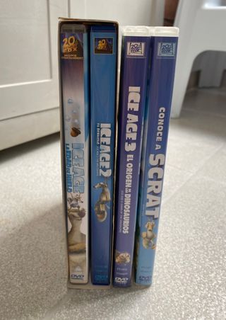 Cuatro DVD de Ice Age en perfecto estado. Incluye Ice Age 1, 2 y 3 + Conoce a Scrat. ¡Un lote ideal para disfrutar en familia! - Cuatro películas de la saga Ice Age. - Incluye la película extra Conoce a Scrat. - Están en perfecto estado.