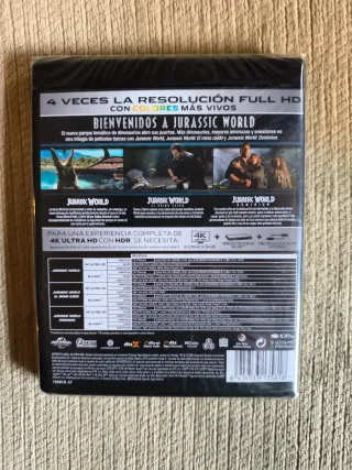 Pack de películas de la saga Jurassic World en formato 4K UHD y Blu-ray. Todas edición española con audio y subtítulos en castellano - Incluye la trilogía completa de Jurassic World. PRECINTADA - Incluye la película Jurassic World: El Renacer. DESPRECINTADA Un solo visionado - Formato 4K Ultra HD + Blu-ray.