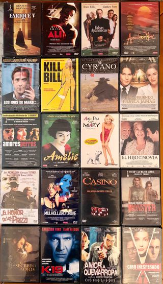 Lote de películas en formato DVD. 139 películas y 33 documentales. - Enrique V - Ali - Falsas Apariencias - Apocalypse Now - Los Idus de Marzo - Kill Bill - Cyrano de Bergerac - Descubriendo Nunca Jamás - Amores Perros - Amelie - Algo Pasa con Mary - El Hijo de la Novia - El Honor de los Prizzi - Mulholland Drive - Casino - Monster - El Secreto de sus Ojos - K-19: The Widowmaker - Amor a Quemarropa - Giro Inesperado
