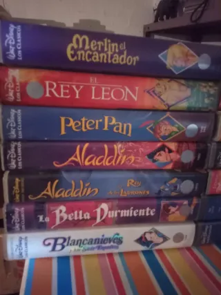 Colección de películas clásicas de Disney en formato VHS. Son 31 películas - Bichos - La Sirenita - Peter Pan - Aladdin - Toy Story 2 - Hook - La Cenicienta 2 - El ratón policia - Pippi Calzaslargas - El Rey León - Dinosaurio - La Bella y la Bestia - Timón y Pumba - Pluto - Blancanieves y los Siete Enanitos - Los Aristogatos - etc.