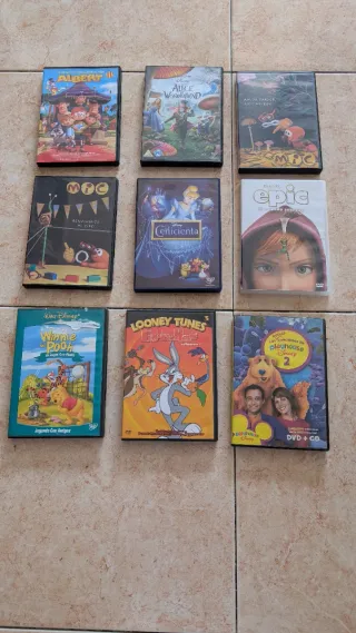 Colección de 9 películas infantiles en formato DVD. - Albert - Alice in Wonderland - Mic (Amiga Tardor) - Mic (Benvinguts al Circi) - Cenicienta - Epic - Winnie the Pooh: Jugando con amigos - Looney Tunes Estrellas Vol. 1 - Nuevas Canciones de Playhouse Disney 2 Cada uno 5€ consultar por mas unidades