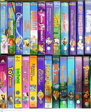 24 películas Disney en VHS original. Películas incluidas: -Pinocho -Canta con Nosotros -Los Rescatadores en Cangurolandia -La Bruja Novata -Tod y Toby -Hércules -Merlín el Encantador -El Jorabado de Notre Dame -El Príncipe Mendigo -Bichos -Toy Story -El Zapatero y la Princesa -Los Aristogatos -101 Dálmatas -La Dama y el Vagabundo -Los Rescatadores -El Tesoro de la lámpara perdida -La Bella Durmiente -Alicia en el País de las Maravillas -El Impostor Espacial