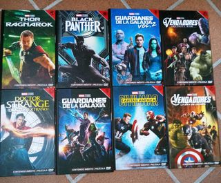 MARVEL STUDIOS. Contenido inédito + película DVD/Idiomas: Castellano, ingles, hindi, inglés audio descriptivo. - Doctor Strance (Doctor Extrano). 61 páginas. 110 mínutos. - Civil War-Capítan América. 61 páginas. 141 mínutos. - Thor: Ragnarok. 61 páginas. 125 mínutos. (leve golpe en la portada esquina baja del lomo.) - Black Panther. 61 páginas. 129 mínutos. - Los Vengadores. La era de Ultrón. 61 páginas. 135 mínutos. - Los Vengadores. Infinity War. 61 páginas. 149 mínutos. - Guardianes de la Galaxia. 61 páginas. 110 mínutos. - Guardianes de la Galaxia, Vol. 2. 61 páginas. 130 mínutos. Unidad a 9 € todos con DVD en perfecto estado.