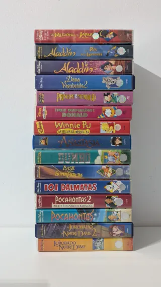 Lote de 15 películas de Disney en formato VHS. Incluye títulos clásicos y modernos. - El Retorno de Jafar - Aladdin - Aladdin 2 - Dama y Vagabundo 2 - El Jorobado de Notre Dame - El Jorobado de Notre Dame 2 - Pocahontas - Pocahontas 2: Viaje a un Nuevo Mundo - 101 Dálmatas - Basil, el ratón superdetective - Anastasia - Winnie Pu - Feliz Cumpleaños, Donald - El Príncipe y el Mendigo De regalo, My Little Pony y Shelly Club