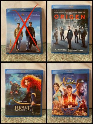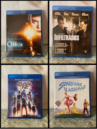 Películas en formato Blu-ray en muy buen estado. Precios por packs: 1 peli 7€ 2 pelis 13€ (6,50€/unidad) 3 pelis 19€ (6,33€/unidad) 4 pelis 25€ (6,25€/unidad) 5 pelis 30€ (6,00€/unidad) IMPORTANTE: Por cada película precintada, se suma 1€ extra al precio final (marcadas con *). Películas disponibles: - Los otros * - Infiltrados - Ready Player One - Sonrisas y lágrimas - Origen - Brave / Indomable - Aladdín - Gattaca * - ¡Rompe Ralph! * - Sing Street * - Detective Pikachu * - Del revés * - Gladiator - Up * - It Follows - Coco - La llegada * - Warcraft * - Monstruos S.A