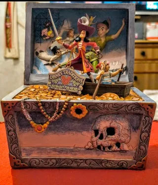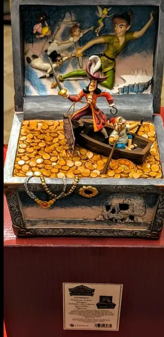 Hermosa figura 3D que representa un cofre del tesoro lleno de monedas de oro con escenas de los personajes "Peter Pan","Capitán Garfio (Hook)" y su hombre fiel "Smee". Diseño detallado del cofre y personajes de la película clásica de Disney. Materiales de alta calidad. Fabricada por "ENESCO" en polirresina y carbonato de calcio.Escena bellamente detallada del arte de Jim Shore.Producto con licencia oficial. NUEVA.SIN ESTRENAR. (PRECIO AJUSTADO AL MÍNIMO.NO SE ADMITEN OFERTAS).