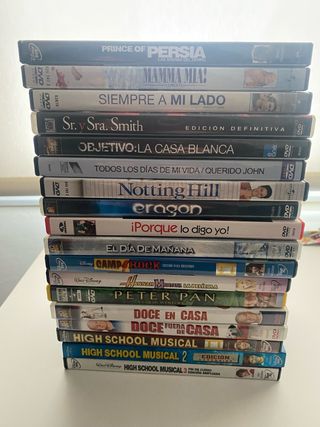 Lote de películas en formato DVD para disfrutar en casa. - Prince of Persia: Las Arenas del Tiempo - Mamma Mia! - Siempre a mi lado - Sr. y Sra. Smith - Objetivo: La Casa Blanca - Todos los días de mi vida / Querido John - Notting Hill - Eragon - ¡Porque lo digo yo! - El día de mañana - Camp Rock - Hannah Montana: La Película - Peter Pan: La Gran Aventura - Doce en casa - Doce fuera de casa - High School Musical - High School Musical 2 - High School Musical 3 - Saga Crepúsculo (5 pelis)