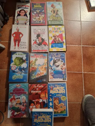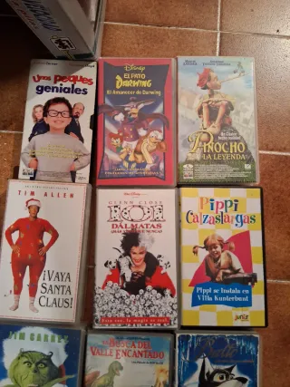 Colección de 12 películas infantiles en formato VHS. Incluye títulos variados para toda la familia. - Un Pequeños Geniales - El Pato Dairinting - Pinocho La Leyenda - Tim Allen ¡Vaya Santa Claus! - 101 Dálmatas - Pippi Calzaslargas - El Grinch - En Busca del Valle Encantado - Balto - La Isla de los Picapiedra - La Casita de Chocolate - Disney's Magic English Familia