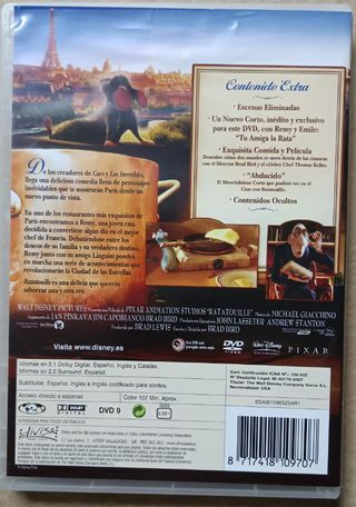 DVD de "Ratatouille", película de animación de Disney Pixar, concretamente se trata de una edición especial con su funda/Splicover. Incluye la película completa y contenido extra como cortos animados, escenas eliminadas y actividades ocultas. Estéticamente como puede apreciarse en general está bien. Edición en castellano, con idiomas Inglés y Catalán. Etiquetas: El Padrino, Star Wars, Pulp Fiction, Gladiator, Matrix, Titanic, Inception, Interstellar, Forrest Gump, Jurassic Park, Terminator, Regreso al Futuro, Braveheart, La Lista de Schindler, Fight Club, Alien, Indiana Jones, Rocky, Toy Story, Harry Potter, El Rey León, Tiburón.