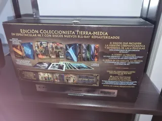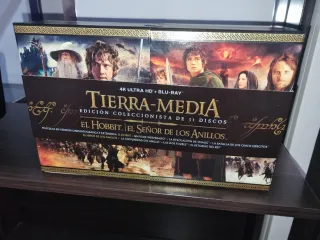 Edición coleccionista de El Señor de los Anillos y El Hobbit en 4K Ultra HD y Blu-ray. - Incluye las películas en versión cinematográfica y extendida. - Contiene 31 discos en total. - Títulos: El Hobbit: Un Viaje Inesperado, La Desolación de Smaug, La Batalla de los Cinco Ejércitos, La Comunidad del Anillo, Las Dos Torres, El Retorno del Rey.