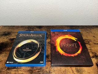 Saga completa del Señor de los anillos y El Hobbit, compuesta por las seis peliculas, contiene, idioma castellano. En formato Bluray, El señor de los anillos incluye 3 discos y El hobbit 6 discos. Originales, en perfecto estado, tanto caratulas como discos. Procede de mi colección personal. Entrega en mano o envío a cargo del comprador. Puedes encontrar más películas DVD y blu-ray en mi perfil!