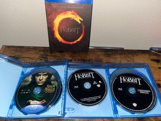 Las 3 películas en bluray y versión extendida. Cada película contiene 5 discos: discos 1 y 2 la película con audios en castellano e inglés. Discos 3 y 4 contiene, entre otros, documentales, mapas interactivos, música, efectos sonoros, estreno de película. Disco 5 los pormenores y circunstancias del rodaje detrás de las cámaras. Los 3 últimos discos con audio en inglés y subtitulos en castellano.