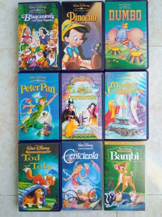 Colección de 13 películas clásicas de Disney en formato VHS. 2€ la unidad. 12€ el lote. - Blancanieves y los Siete Enanitos - Pinocho (Edición Especial) - Dumbo - Peter Pan - La Bella Durmiente - Merlín el Encantador - Tod y Toby - La Cenicienta - Bambi (Totalmente Remasterizada)