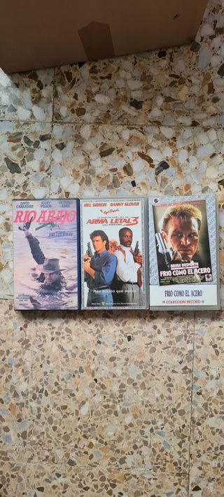 Lote de tres películas en formato VHS. - Rio abajo - Arma Letal 3 pequeño saltamontes david carradine . REGALO frio como el acero . videoclub video betamax vhs . dia madre . porro . mago oz . origen . apocalipsis canibal zombie zombi . marbella . italiana cine español . pantera . elvira . made in china . kung fu . ninja . malibu . star wars guerra galaxias . jedi . han solo . skywalker . ewok . guerra . mundo futuro . night force . colinas . carpenter . rollerball . horrores . cortocircuito . troopers . giallo . rocky . porkys . albondigas . alien