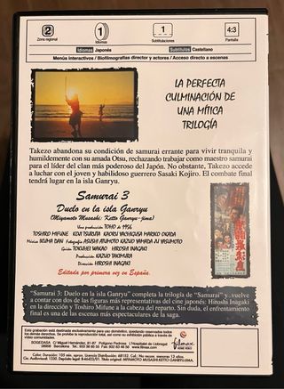Película Samurai 3: Duelo en la Isla de Hiroshi Inagaki. - Versión original subtitulada en castellano. - Incluye logo de Toho y Filmax Home Video.