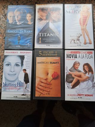 Lote de seis películas en VHS en buen estado. Algunas de las películas incluidas son: Algo pasa con Mary, Novia a la fuga, Titanic y American Beauty.- Películas para amantes del inglés. Se vende el lote por 9,50€ ó 1,80 € la unidad.