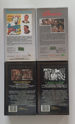 Preciosa colección de cintas VHS del Cine Español protagonizadas por Carmen Sevilla. - Incluye las películas Secretaria para todo y La Venganza. - También se incluyen Joyas del Cine Español: Violetas Imperiales y Bella de Cadiz. - Formato VHS.