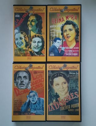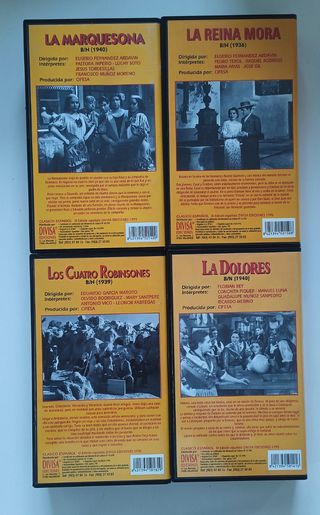Conjunto de cuatro películas clásicas del cine español en formato VHS. Incluye títulos de cine musical. - La Marquesona - La Reina Mora - Los Cuatro Robinsones - La Dolores