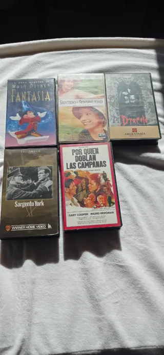 Colección de 5 cintas de vídeo VHS con películas clásicas. - Fantasía - Sentido y Sensibilidad - Drácula - Sargento York - Por quién doblan las campanas Más títulos en las fotos