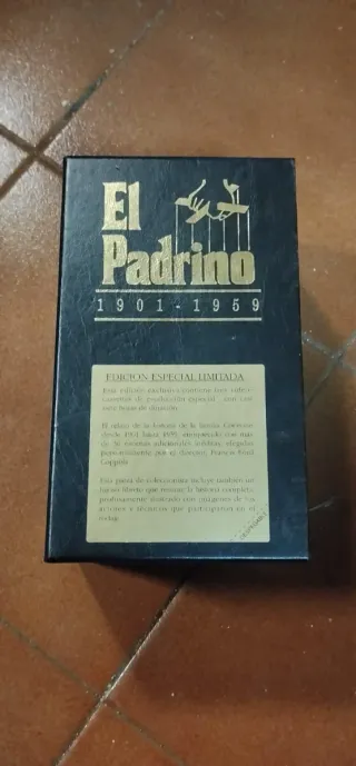 Edición especial limitada de El Padrino en formato VHS. Esta colección exclusiva contiene tres videos de producción especial con material inédito. - Incluye El relato de la historia de la familia Corleone desde 1901 hasta 1959. - Contiene más de 30 escenas eliminadas, elegidas personalmente por el director, Francis Ford Coppola. - Pieza de coleccionista con un libreto que resume la historia completa, profusamente ilustrado con imágenes de los errores y escenas que participaron en el rodaje.