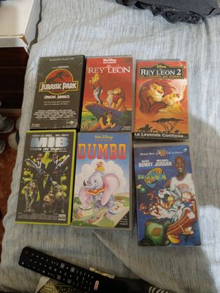 6 películas VHS, rey león, rey leon2, mib, Dumbo, space Jam, jurassic park