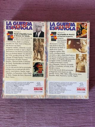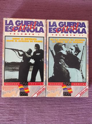 Colección de dos volúmenes de La Guerra Española en formato VHS. - Volumen I: Desde la República hasta el Alcázar de Toledo. - Volumen II: De la Batalla de Madrid al final de la Guerra. - Imágenes inéditas de 1936-1939. - Incluye el logo de Interviú.
