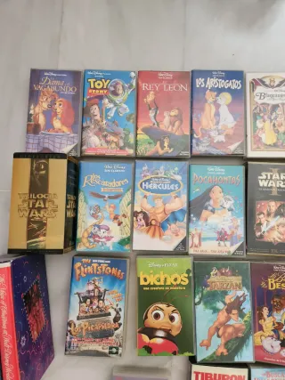 Colección de 30 cintas VHS de películas clásicas de Disney y la saga Star Wars. Ideal para coleccionistas y amantes del cine. Español, excepto el pack del parque disney en ingles. - Películas de Disney como El Rey León, Pocahontas, Hércules, La Bella y la Bestia, y más. - Incluye títulos de Star Wars. - Formato VHS.