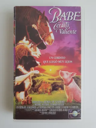 Película Babe, el cerdito valiente en formato VHS. - Título en español: Babe, el cerdito valiente. - Subtítulo: Un cerdito que llegó muy lejos. - Incluye el logo de Universal Pictures.