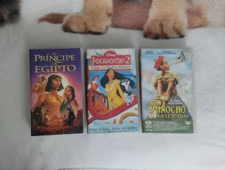 Conjunto de tres películas infantiles en formato VHS.Disney y otros. - El Príncipe de Egipto - Pocahontas 2: Viaje a un Nuevo Mundo - Pinocho: La Leyenda Dudas o más fotos por privado. Alguna marca en la funda de plástico carátula pero conservado como nuevo