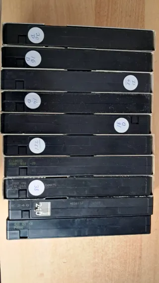 Conjunto de cintas VHS grabadas, listas para su uso. - Marcadas con números y letras para fácil identificación. - Algunas cintas tienen etiquetas adicionales con información. - Formato de vídeo VHS.