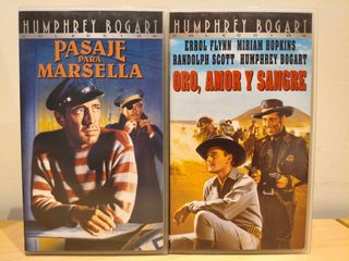 Dos películas VHS de la colección Humphrey Bogart. - Pasaje para Marsella, de Michael Curtiz. - Oro, Amor y Sangre, de Michael Curtiz. Revisadas y rebobinadas.