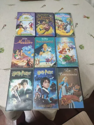 Coge 6 cintas VHS de películas clásicas de Disney y Harry Potter. - La Bella Durmiente - El Jorobado de Notre Dame 2 - El Libro de la Selva - Aladdin - Pocahontas - La Sirenita - Harry Potter y la Cámara Secreta - Harry Potter y la Piedra Filosofal - La Cenicienta