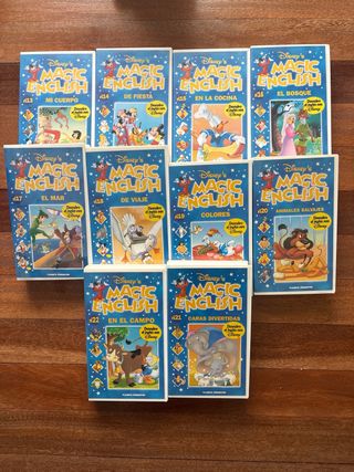 Colección completa de 32 cintas VHS de Disney's Magic English. - Volumen 1: Saludos - Volumen 2: Familia - Volumen 3: Amigos - Volumen 4: Dulce Hogar - Volumen 5: Animales Amigos - Volumen 6: ¡Qué Bueno! - Volumen 7: Feliz Cumpleaños - Volumen 8: ¿Qué Hora Es? - Volumen 9: Noche y Día - Volumen 10: ¡A Jugar! - Volumen 11: Números - Volumen 12: En Casa... hasta el 32