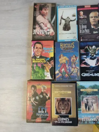 Colección de cintas VHS con películas de diversos géneros. Ideal para coleccionistas. - Incluye títulos como Hércules, Titanic, Los Pandas, Gremlins, Tombstone, y más. - Variedad de géneros: acción, aventura, drama, animación y documentales. - Algunas cintas son de la marca Intervíu. Precio según película y cantidad.
