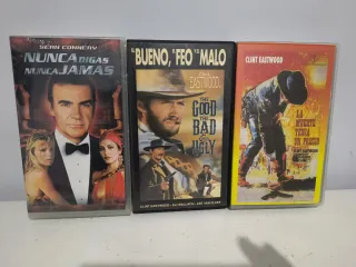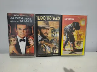 Lote de tres películas en formato VHS. - Nunca digas nunca jamás (Sean Connery) - El bueno, el feo y el malo (Clint Eastwood) - La muerte tenía un precio (Clint Eastwood)