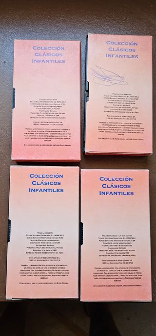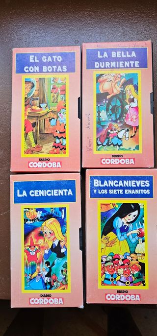 Colección de cuatro cintas VHS de clásicos infantiles en español. Las películas incluidas son: El Gato con Botas, La Bella Durmiente, La Cenicienta y Blancanieves y los Siete Enanitos. Las cajas están en buen estado, con señales normales de uso. - Clásicos animados para toda la familia - Idioma: Español - Formato: VHS